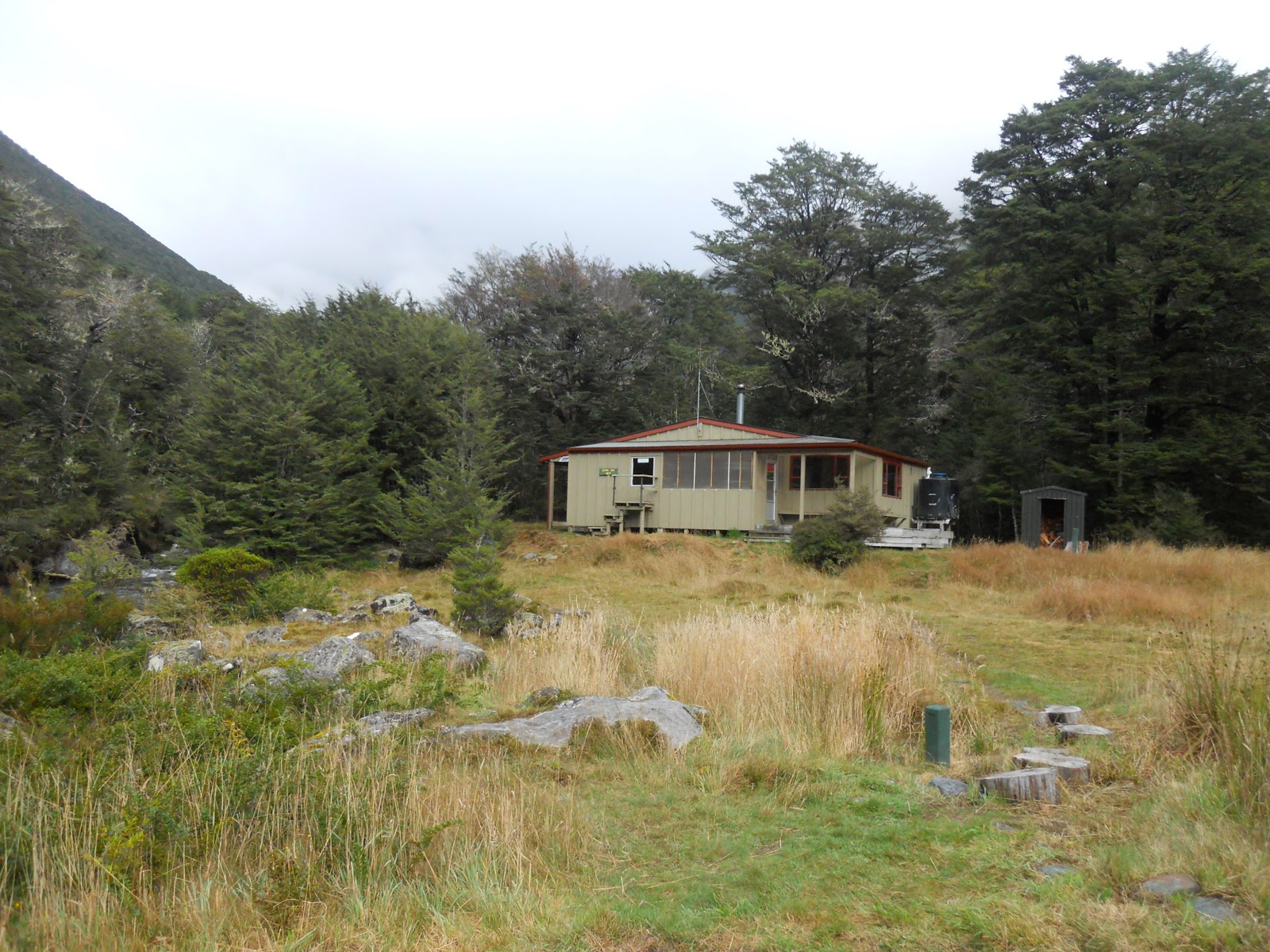 Upper Travers Hut is located in the first finger of bush you can see as you make your way down the Valley. It is a beautiful location with the surrounding mountains and alpine meadows around it.